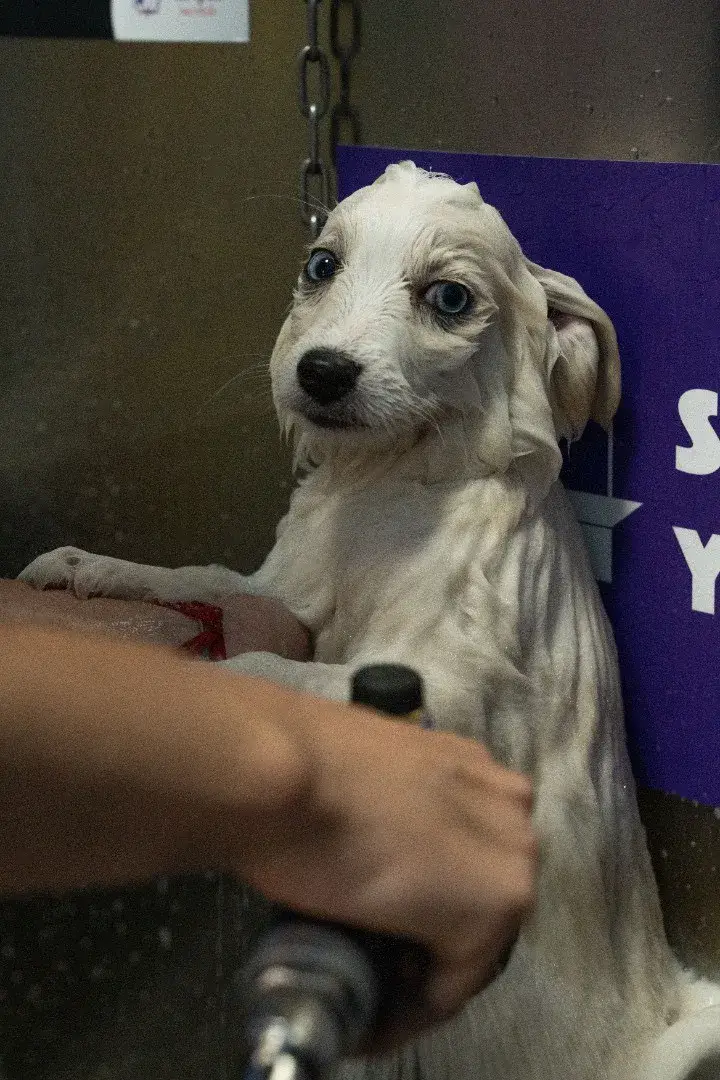 La imagen muestra a un cachorro de pelaje claro, probablemente blanco, con ojos azules. El cachorro está mojado, lo que sugiere que está siendo bañado. Su expresión parece algo triste o melancólica. Una persona, cuya mano es visible, está utilizando una manguera o una ducha de mano para enjuagar al cachorro. Al fondo, se puede ver una cadena metálica y un letrero parcialmente visible con texto. El entorno sugiere que el baño se está realizando en una estación de lavado para mascotas o un entorno similar.