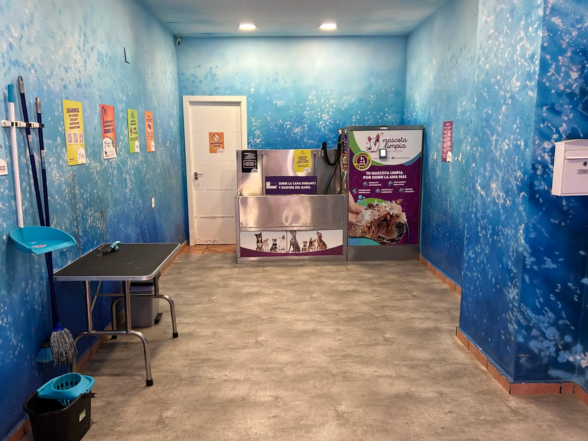 La imagen muestra una sala decorada con un tema acuático. Las paredes están pintadas en tonos azules con un diseño que simula burbujas de agua. En el lado izquierdo de la imagen, hay una mesa de color negro con patas de metal, junto a un cubo de basura pequeño y utensilios de limpieza como una escoba y un recogedor de color azul, además de una fregona con un cubo azul. En la pared de la izquierda, se pueden ver varios carteles coloridos con información y códigos QR. Hacia el fondo de la sala, hay una puerta blanca cerrada. A la derecha de la puerta, se encuentra una máquina de lavado para mascotas con carteles e instrucciones en su superficie, que tiene un diseño predominantemente morado y verde, y muestra imágenes de perros. La máquina está etiquetada como "Mascota Limpia" y está destinada a la limpieza de mascotas. El suelo de la sala es de un material que imita el acabado del concreto en tonos grises. La atmósfera general de la sala es limpia y bien organizada, con un propósito claro de ser un área de lavado para mascotas.